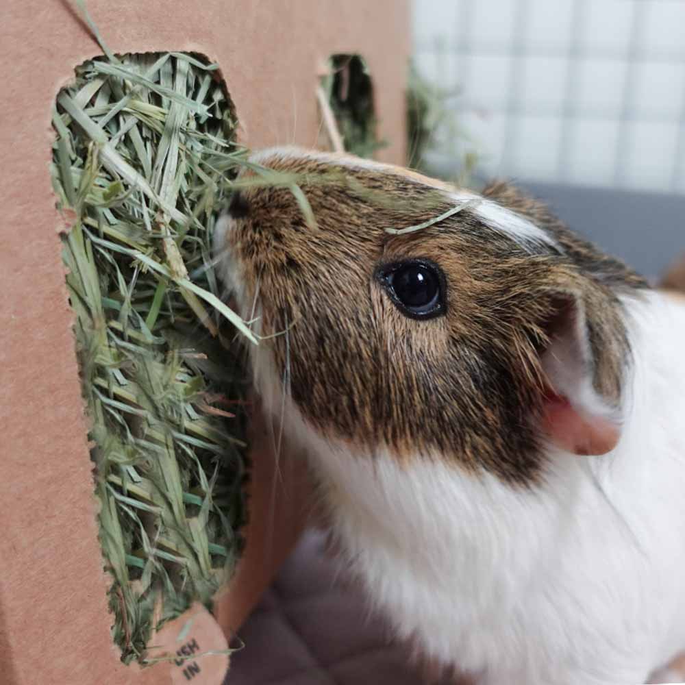 Every product line of GuineaDad Hay (Timothy, Orchard and more in future) go through an extremely meticulous filtration process to remove debris and dirt including the ones that are not visible to naked eye in our top-of-the-line facility. Just like any products we create, our hay also has guinea pig health as our priority. GuineaDad Hay packaging, which doubles as guinea pig feeder, also represents our level of care. As many of you realize daily, moving hay from the packaging to the cage creates unnecessary dust, which are harmful for guinea pigs’ sensitive respiratory system. Our product removes that entire step to ensure the healthiest environment for guinea pigs. GuineaDad hay box also provides mental stimulation by adding extra fun during foraging – GuineaDad Hay’s chewable box encourages healthy chewing behavior, and you will often find many piggies explore different openings on the packaging. GuineaDad’s guinea pig hay feeder system not only helps guinea pigs, but also saves waste and revolutionizes how products would be shipped. Simply remove the perforations and clip from the cardboard box, and you have a fun feeder that essentially gives you two products in one, while saving the planet. Order yours today to not only try our delicious natural hay, but also be included in the pioneering revolution of utilizing all pieces of a shipped product to the fullest.
