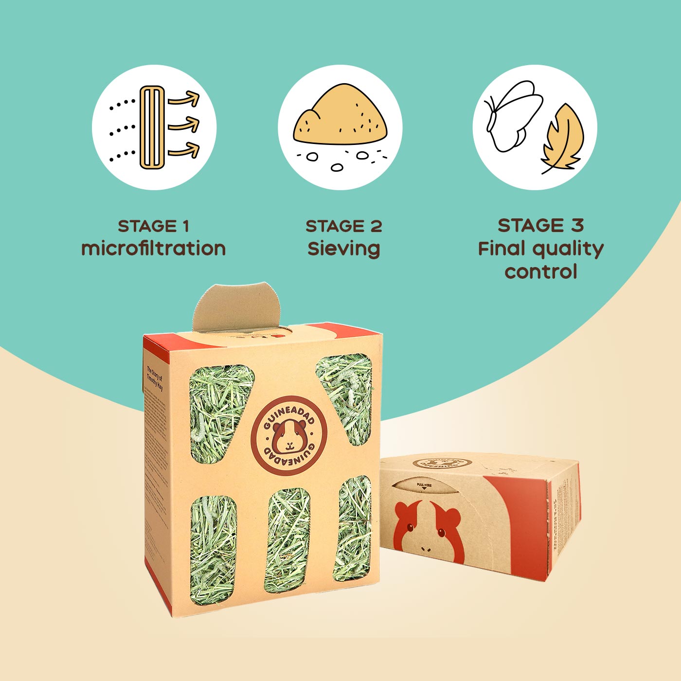 Unfiltered hay can bring rocks, dust, and other debris that can be harmful for rabbits to consume. Our BunnyDad Team runs every bit of our hay through a precisely calibrated dust filter, picking out any rocks, feathers, or other detritus it finds.