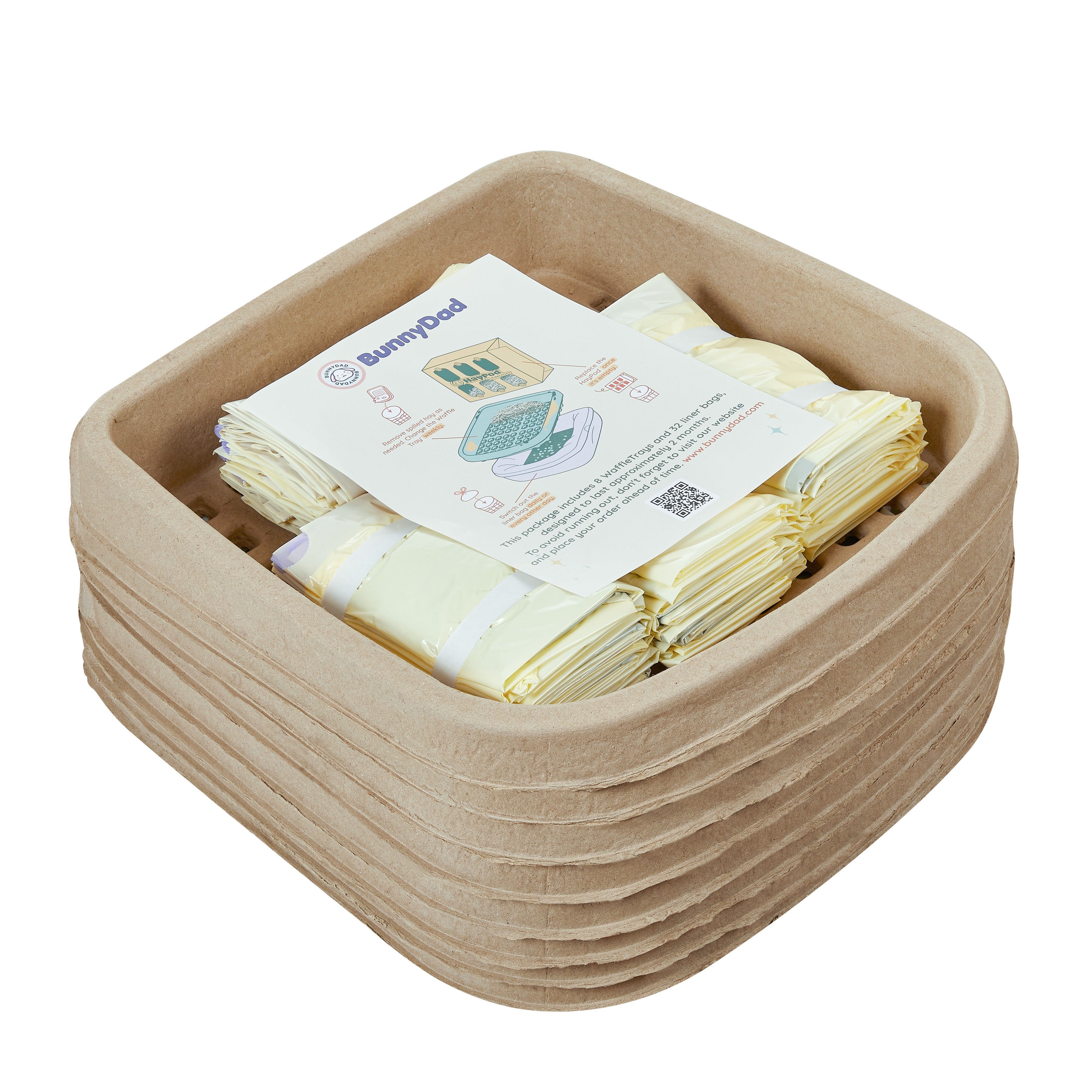 This BunnyLet bundle includes 2 Waffle Trays, 15 liner bags (2 weeks supply), and 5 Hay Pods (up to months supply).