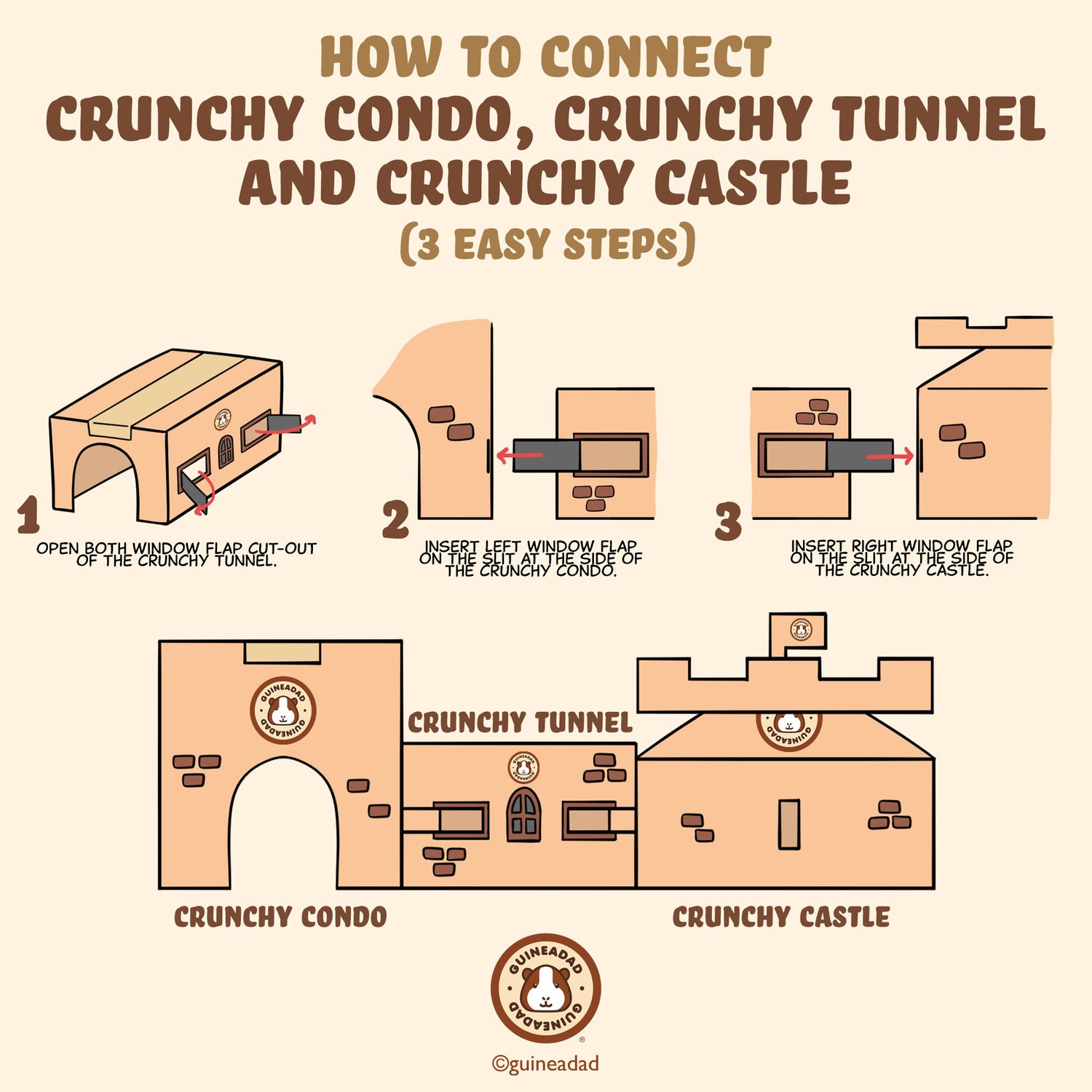 The best part about our innovative packaging is how well they connect together! Our Crunchy Condo also comes with our GuineaDad Full Size Liners. Our Crunchy Tunnel comes from our Small GuineaDad Liners and our Crunchy Castle comes with our GuineaDad Queen's Castle. Have all three? Connect our Crunchy Condo to our other Crunchy Series to create the ultimate hidey!
